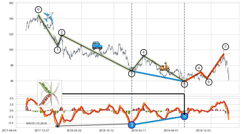 ➢ 波浪理论:猜想达到c点后小反弹终止反转下跌 → 下跌 → 【拐点】临近 → 阶段均值回复结束后继续大周期趋势跟踪