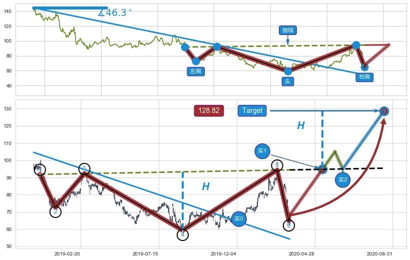 ➢ 头肩底:猜想临近关键阻力位突破点 → 临近拐点上涨 → 机会信号 → 大趋势均值回复