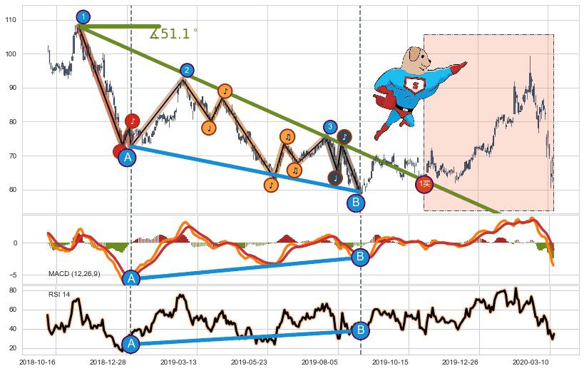 ➣ 趋势线:阻力位已击穿突破,猜想持续向上拉升上涨 → 上涨 →【突破】机会信号 → 大周期均值回复