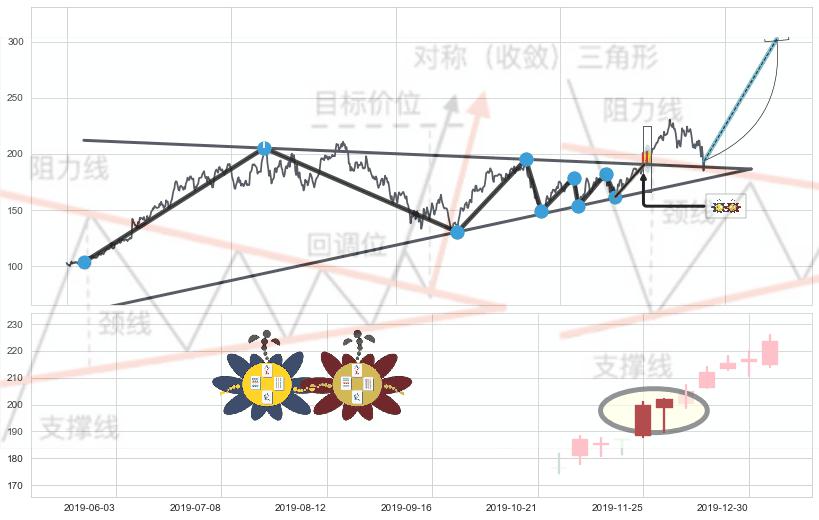 ➣ 【多空双方观望→争持→促使价格波动日益狭窄→多方打破攻守平衡点】对称三角形中继整理, 已在2019-11-26突破【阻力】颈线 190.68 →演变成上升通道