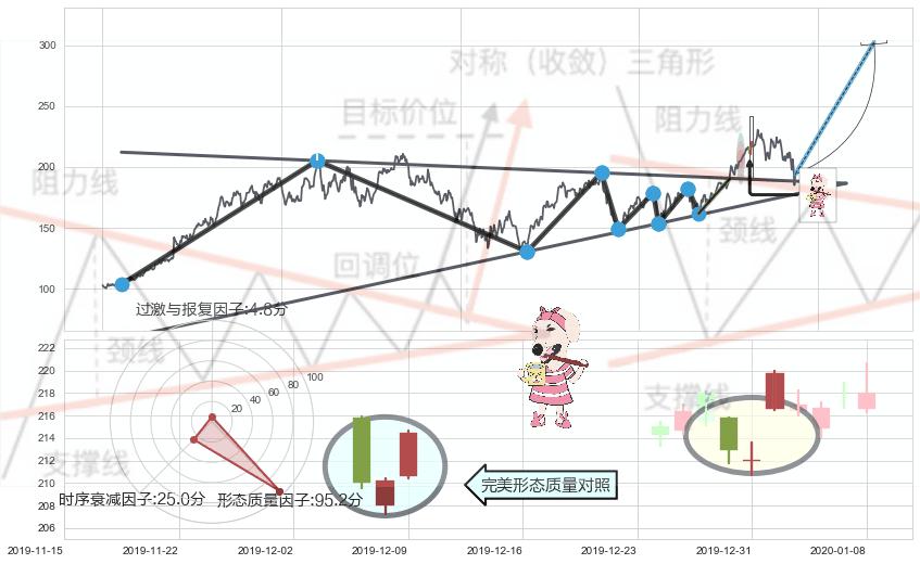 ➣ 上涨螺旋桨形态 + 上升对称三角整理阻力突破转换支撑上涨信号叠加后【目标达成率】中等,【看多】信号叠加【存续影响中等】