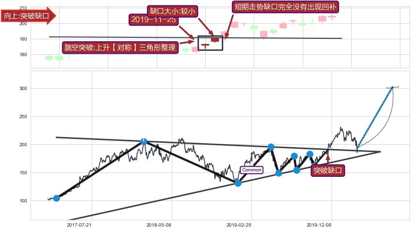 ➣ 普通缺口在【上升【对称】三角形整理】震荡整理形态中出现