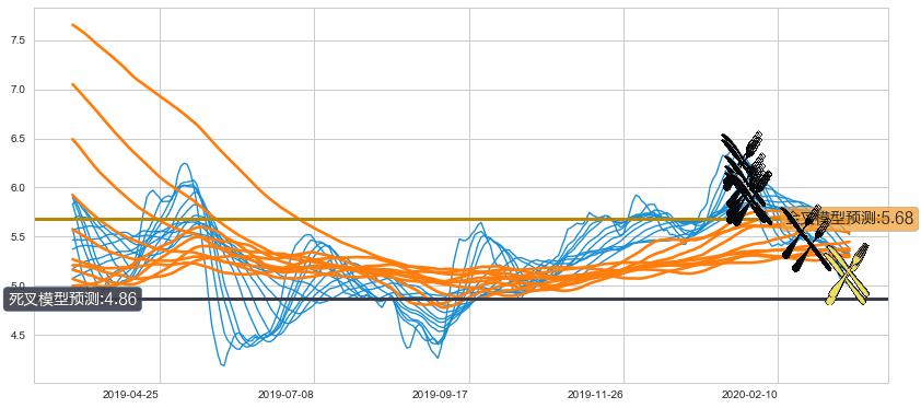 ➣ 30小时均线于(2020-01-24: 5.90)形成【死叉】基于【死叉历史模型】预测死叉后最低波谷价格: 5.18, 死叉后最低价格4.95,已经下跌超出预测最低波谷价格, 预期反弹