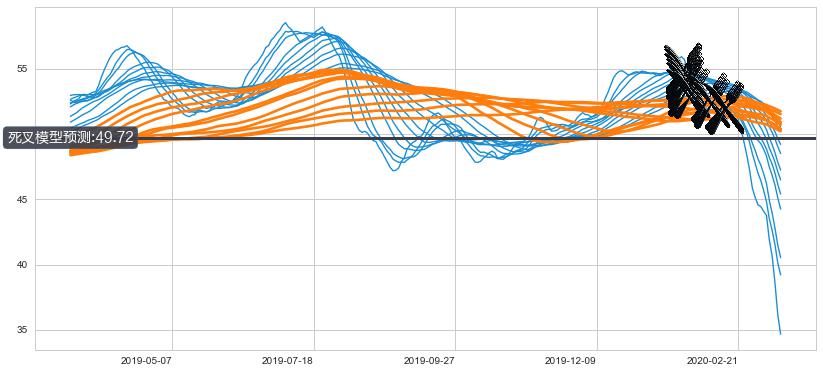 ➢ 90小时均线于(2020-02-13: 51.95)形成【死叉】基于【死叉历史模型】预测死叉后最低波谷价格: 48.28, 死叉后最低价格30.93,已经下跌超出预测最低波谷价格, 预期反弹