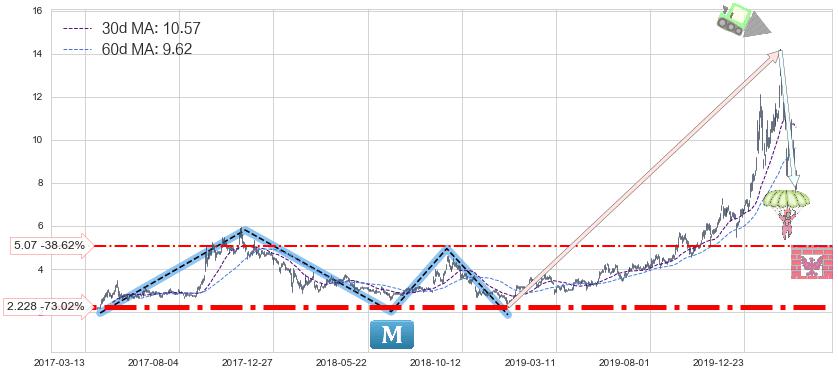 ♘ 支撑价格位2.228,可信任强度95.41%,距离最后交易2020-03-13形成的收盘价格8.26相差 -73.02%