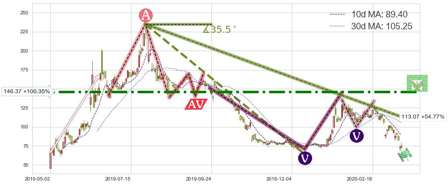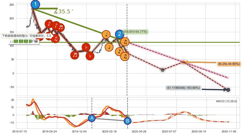 从2019-07-26至2020-03-13,共包含160个交易日,阶段股价下跌-96.36%,阶段股价变动位移路程比: 1 : 5,下跌趋势角度: 35.5