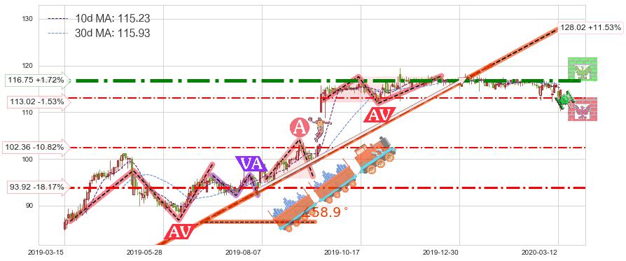 ♘ 阻力价格位116.75,可信任强度91.19%,距离最后交易2020-03-13形成的收盘价格114.78相差 +1.72%