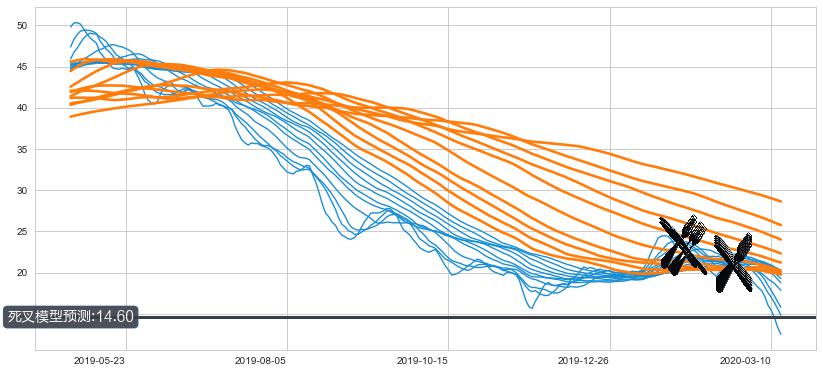 ➣ 55小时均线于(2020-02-21: 21.18)形成【死叉】基于【死叉历史模型】预测死叉后最低波谷价格: 14.68, 死叉后最低价格10.92,已经下跌超出预测最低波谷价格, 预期反弹
