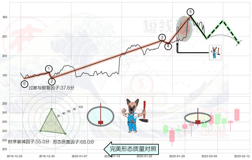 ➢ 🕰 价格走势在2020-01-31至2020-01-31期间形成看跌(高位倒锤头)流星线,残存影响值:-4.86