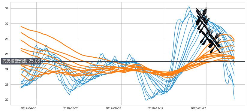 ➣ 70小时均线于(2020-02-06: 27.75)形成【死叉】基于【死叉历史模型】预测死叉后最低波谷价格: 23.75, 死叉后最低价格17.76,已经下跌超出预测最低波谷价格, 预期反弹