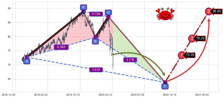 ➣ 谐波螃蟹:猜想c点拉升接近b点后强阻力来临下沉下跌(均值回复)
