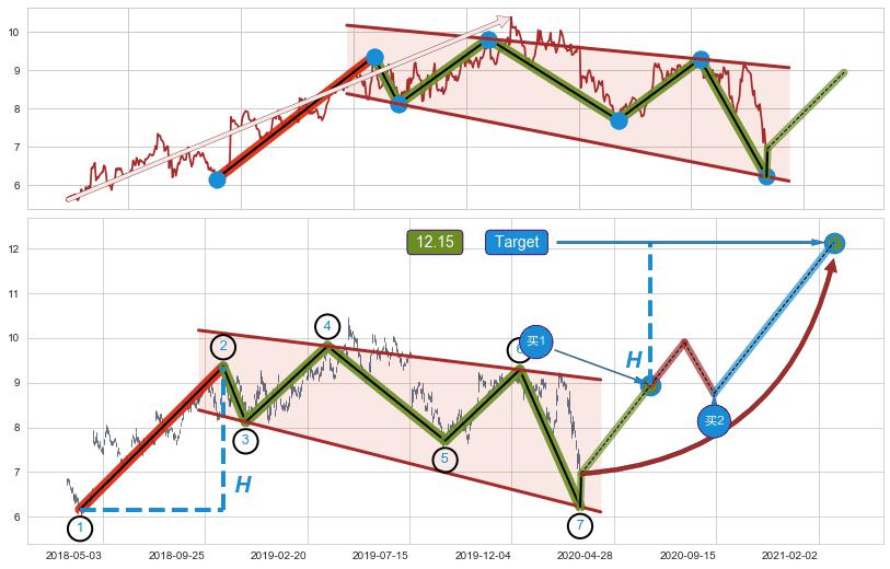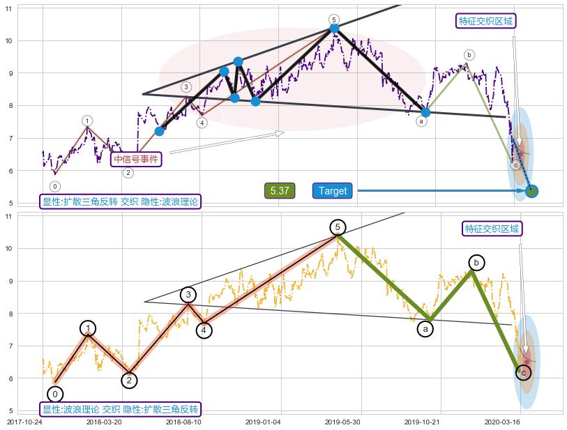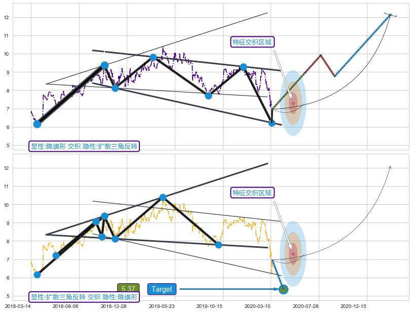 ➣ 扩散三角反转:猜想下跌target达成后 → 上涨 → 机会信号 → 大趋势均值回复