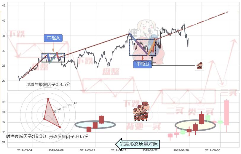 ➣ 【中枢B】:2019-04-24-2019-09-13,中枢由3笔构成,共100交易日, ZG=33.64, ZD=28.56