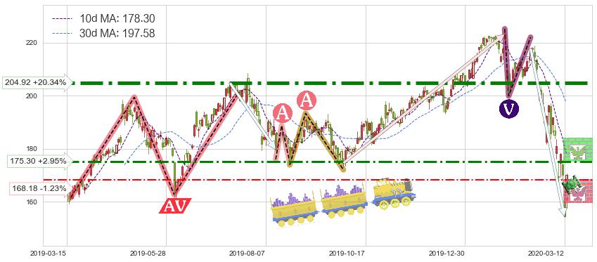 ♘ 阻力价格位175.30,可信任强度59.25%,距离最后交易2020-03-13形成的收盘价格170.28相差 +2.95%
