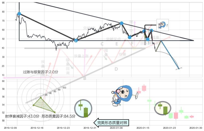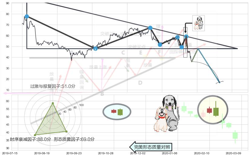 ➢ 【多方力量耗尽,空方打破攻守平衡点】下降三角形中继整理, 已在2020-02-26突破【支撑】颈线 48.00 →演变成下降通道