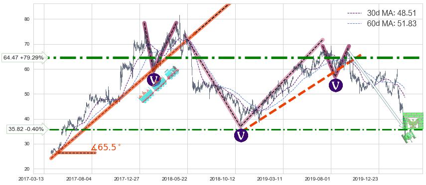 ♘ 阻力价格位64.47,可信任强度93.24%,距离最后交易2020-03-13形成的收盘价格35.96相差 +79.29%