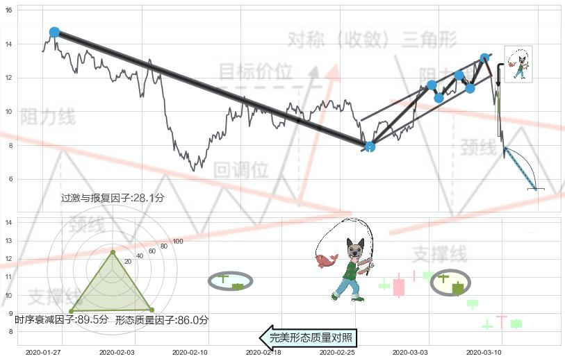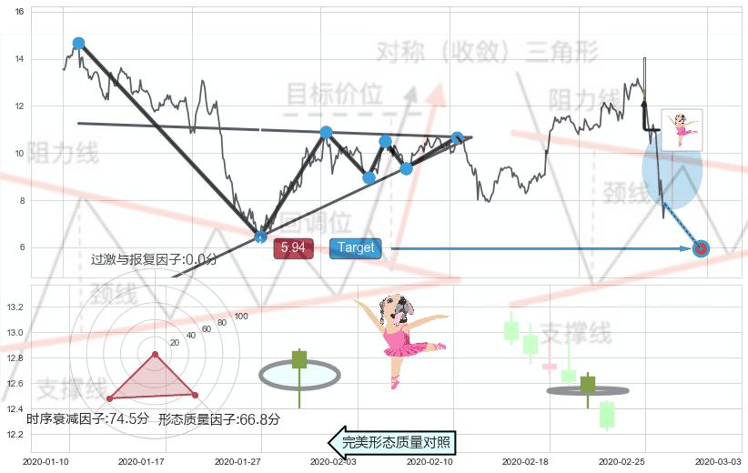 ➢ 曙光初现形态 🔜 下降对称三角整理临近target支撑拐点上涨 综合量化分数:50.43 【中性】