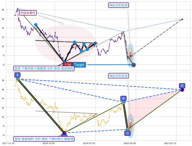 ➢ 下降对称三角整理属【中级别信号事件】谐波伽利属【长级别信号事件】中长周期组合信号事件,中长事件长度比54.58%
