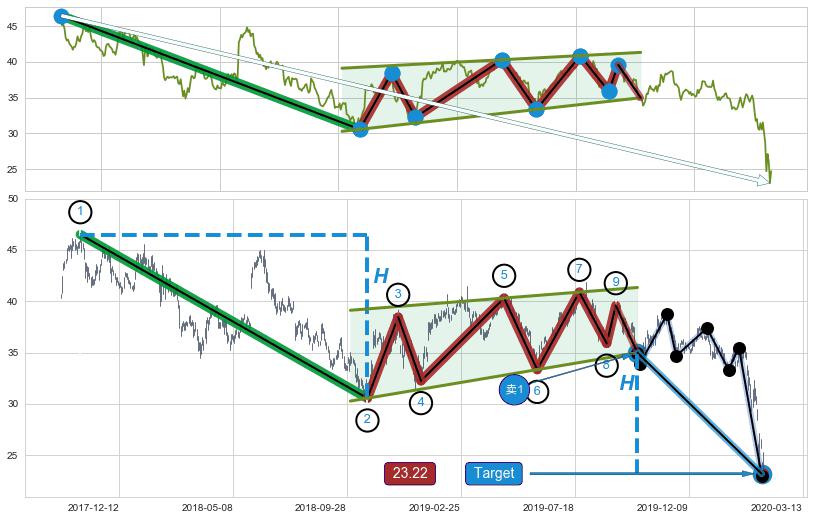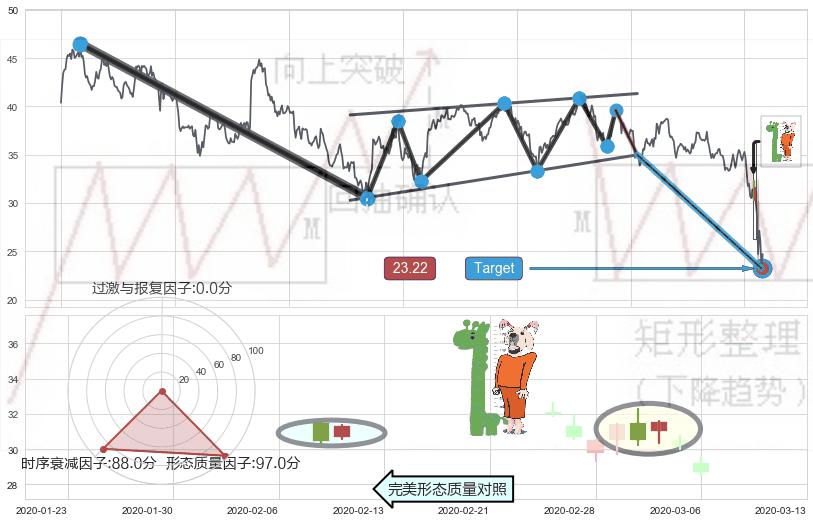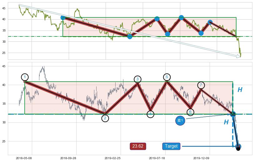 ➣ 下跌矩形整理:下跌target达成后 → 猜想下跌动能竭尽反转上涨 → 机会信号 → 大趋势均值回复