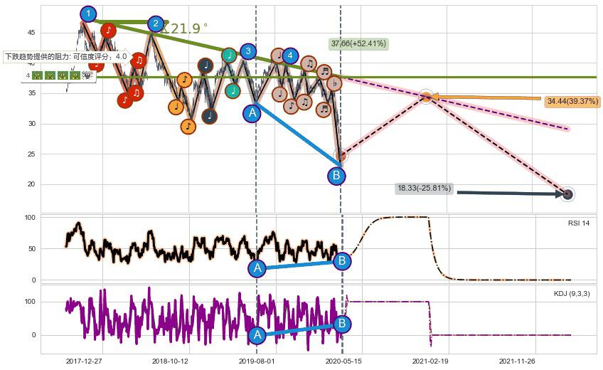 ♘ 在最后的下跌阶段2017-10-24至2020-03-13,存在 持续未破位的阻力位 ,阻力价格37.66,可信任强度84.87%,其距离最后价格24.71相差 +52.41%