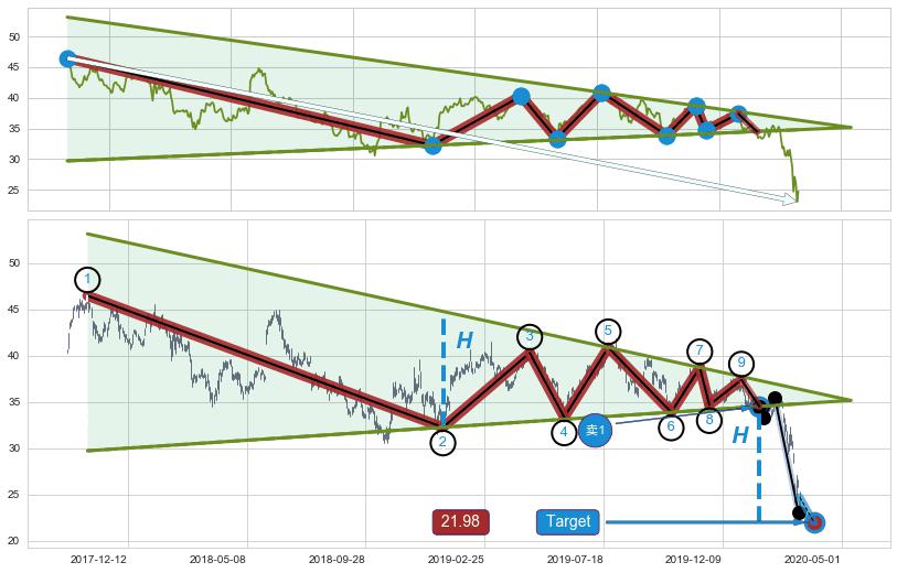 ➣ 【已确认突破】下降【对称】三角形整理 起点:2017-10-24,突破点:2020-01-24,形态共566交易日