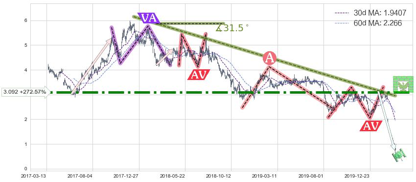 从2017-12-11至2020-03-13,共包含567个交易日,阶段股价下跌-155.47%,阶段股价变动位移路程比: 1 : 8,下跌趋势角度: 31.5,2020-02-19向↘︎形成缺口,跳空下跌-44.26%˚