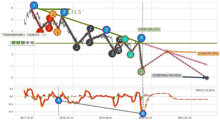 ♘ 在最后的下跌阶段2017-12-11至2020-03-13,存在 持续未破位的阻力位 ,阻力价格2.948,可信任强度73.69%,其距离最后价格0.8300相差 +255.22%
