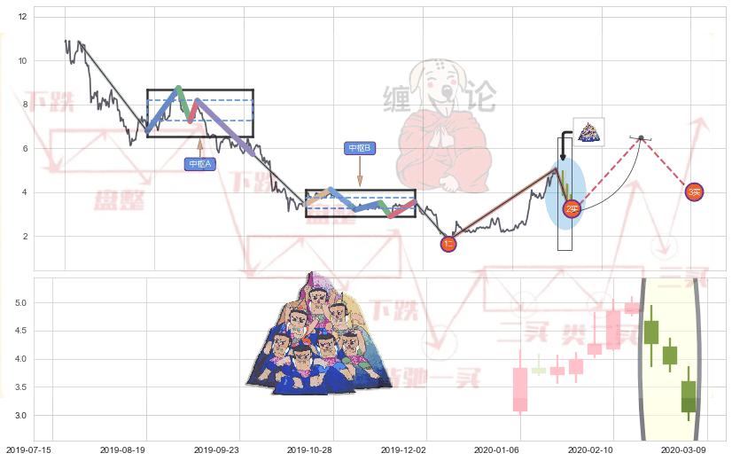 ➣ 【中枢B】:2019-01-08-2019-07-03,中枢由6笔构成,共123交易日, ZG=3.510, ZD=3.430
