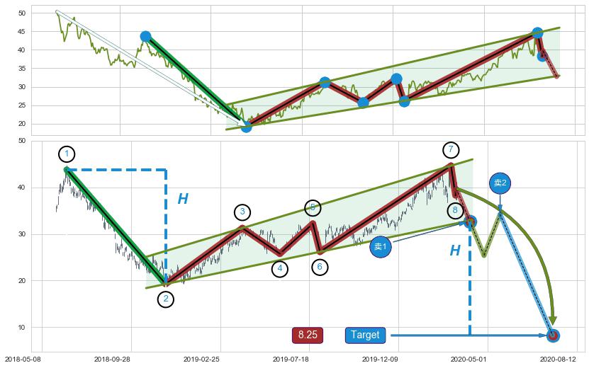 ➣ 升旗形:猜想临近关键支撑位突破点 → 临近拐点下跌 → 风险信号 → 大趋势均值回复