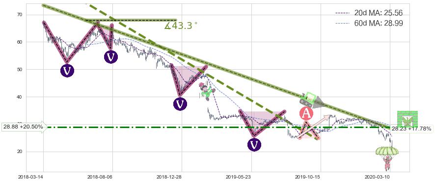 从2018-03-14至2020-03-13,共包含504个交易日,阶段股价下跌-86.25%,阶段股价变动位移路程比: 1 : 7,下跌趋势角度: 43.3,2019-02-22向↘︎形成缺口,跳空下跌-27.46%˚