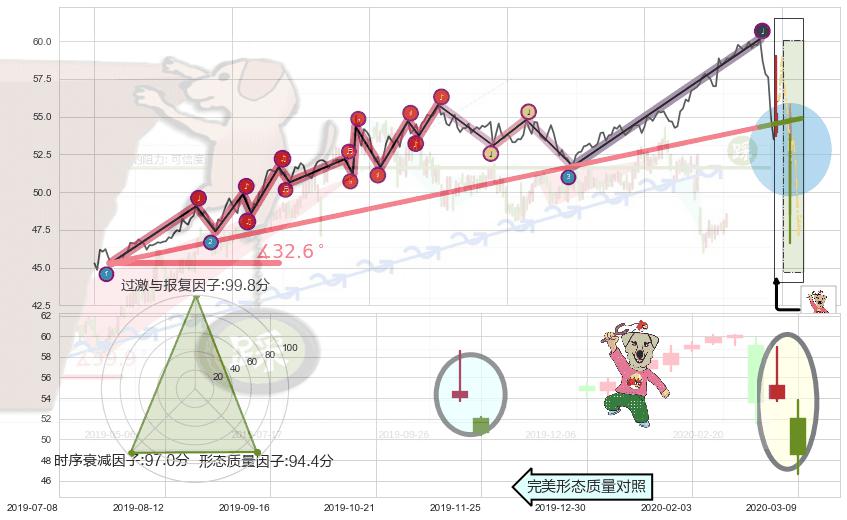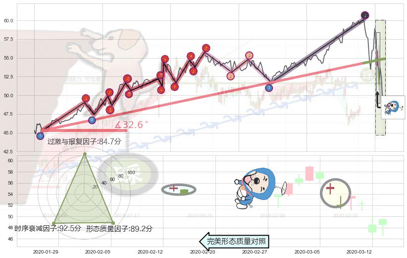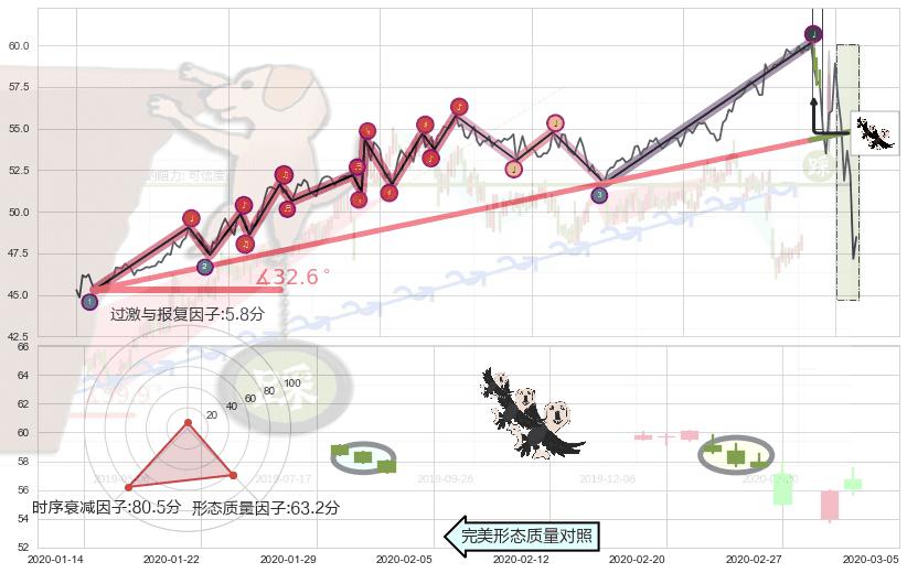 ➢ 2019-03-15-2020-02-21上升趋势存在反转[风险],其原上升趋势的支撑位(54.88)已破位[强阻力信号],原上升趋势角度: 32.6˚