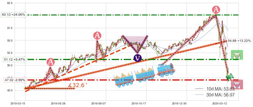 ✂️ 2019-03-15-2020-02-21上升趋势存在反转[风险],其原上升趋势的支撑位(54.88)已破位[强阻力信号],原上升趋势角度: 32.6˚