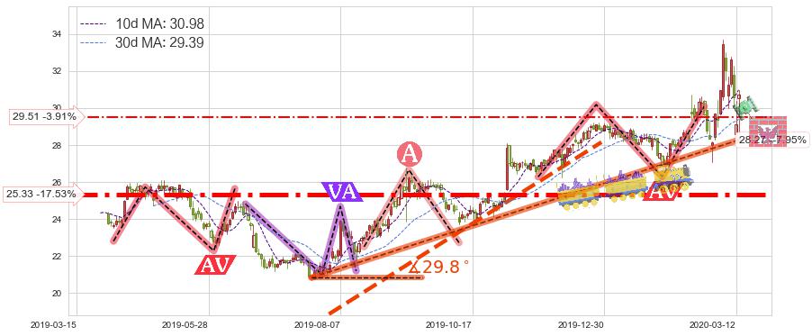 ♘ 支撑价格位29.51,可信任强度37.29%,距离最后交易2020-03-13形成的收盘价格30.71相差 -3.91%