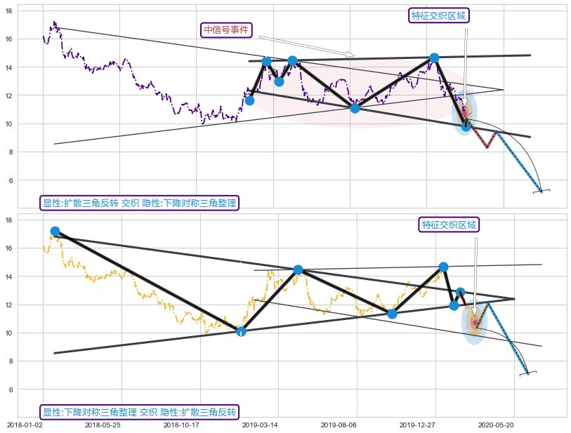 ➢ 下降对称三角整理:下行突破支撑位破位, 猜想持续下沉下跌,被突破的支撑位已变为阻力位