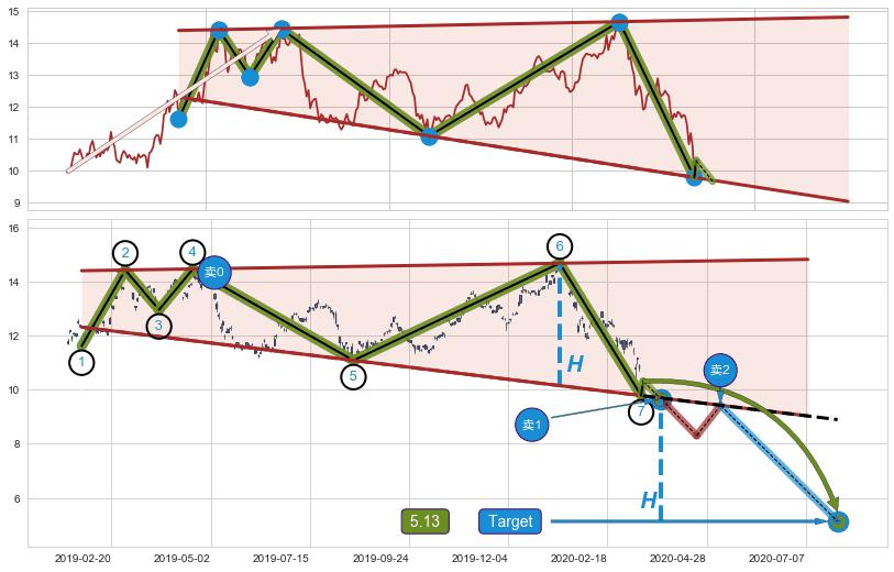 ➣ 扩散三角反转:猜想临近关键支撑位突破点 → 临近拐点下跌 → 风险信号 → 大趋势均值回复