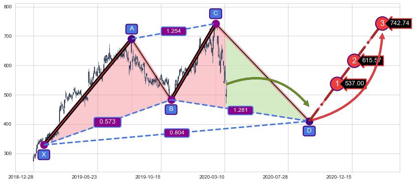 ➣ D点拟合预测价格409.83,距离最后交易收盘价格535.69相差 -23.49%