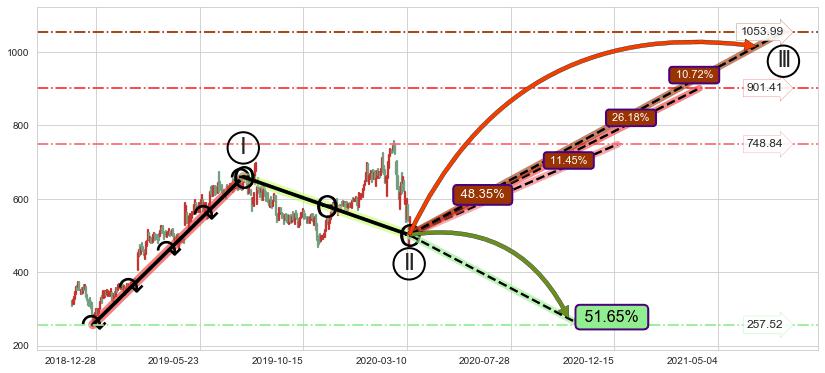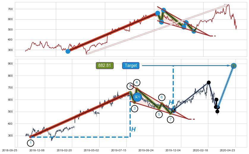 ➢ AI预测: 假定反转启动后, 第❷目标位置(2020-12-21, 615.57)