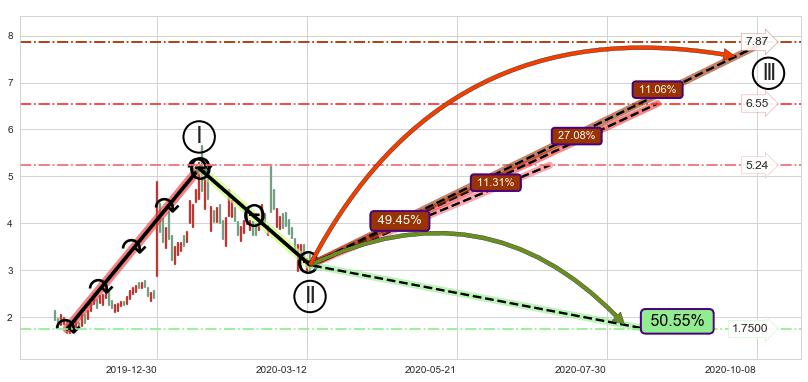 ➣ 高概率大级别循环上涨浪被破坏,反转向下(突破5浪起点)概率50.55%