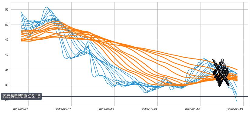 ➣ 90小时均线于(2020-02-19: 32.89)形成【死叉】基于【死叉历史模型】预测死叉后最低波谷价格: 27.03, 死叉后最低价格22.52,已经下跌超出预测最低波谷价格, 预期反弹