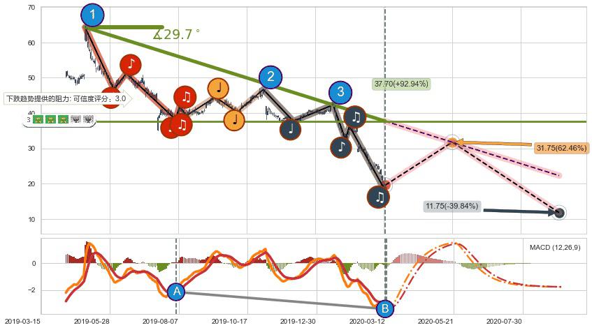 从2019-05-01至2020-03-13,共包含220个交易日,阶段股价下跌-109.46%,阶段股价变动位移路程比: 1 : 3,下跌趋势角度: 29.7