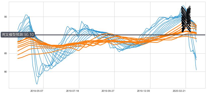 ➣ 90小时均线于(2020-02-21: 92.43)形成【死叉】基于【死叉历史模型】预测死叉后最低波谷价格: 86.91, 死叉后最低价格74.07,已经下跌超出预测最低波谷价格, 预期反弹
