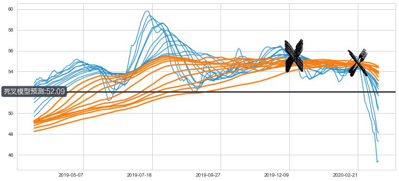 ➢ 120小时均线于(2020-02-21: 54.64)形成【死叉】基于【死叉历史模型】预测死叉后最低波谷价格: 49.90, 死叉后最低价格39.80,已经下跌超出预测最低波谷价格, 预期反弹