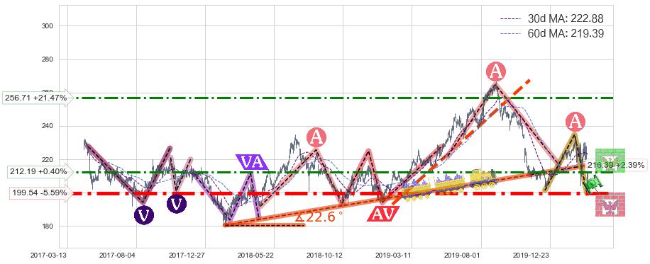 ♘ 阻力价格位212.19,可信任强度58.75%,距离最后交易2020-03-13形成的收盘价格211.34相差 +0.40%