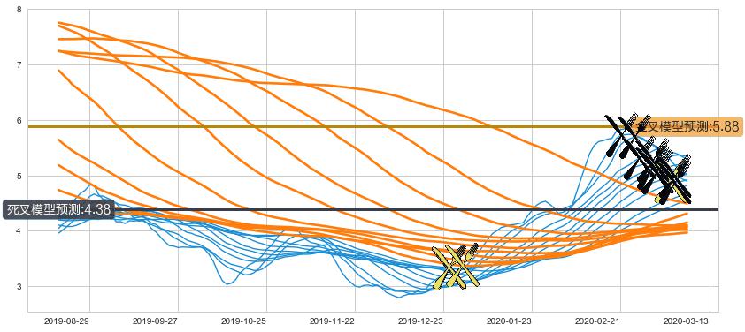 ➣ 13小时均线于(2020-02-26: 5.69)形成【死叉】基于【死叉历史模型】预测死叉后最低波谷价格: 5.20, 死叉后最低价格4.51,已经下跌超出预测最低波谷价格, 预期反弹