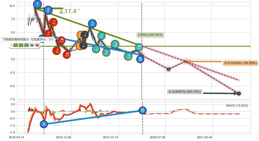 从2018-05-17至2020-03-13,共包含459个交易日,阶段股价下跌-152.52%,阶段股价变动位移路程比: 1 : 13,下跌趋势角度: 37.4