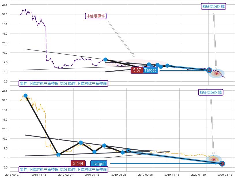 ➢ 下降对称三角整理属【短级别信号事件】缠论中枢点属【长级别信号事件】长短周期组合信号事件, 短长事件长度比18.99%