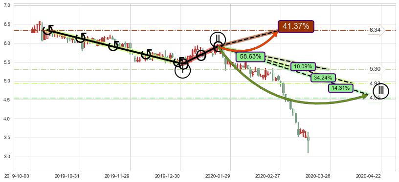 ➣ 循环浪继续向下【平均值】位置(2020-04-08, 4.93),匹配聚类样本比例58.39%, 可能性概率34.24%