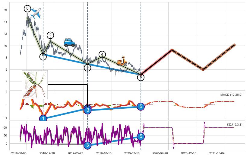 ➣ 第一, 三, 五浪下跌动能逐渐【衰弱变小】,趋势呈现不稳迹象