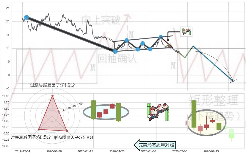 ➢ 下降三部曲(降势三鹤) 🔜 升旗形支撑破位转换阻力下跌 综合量化分数:36.77 【偏空】
