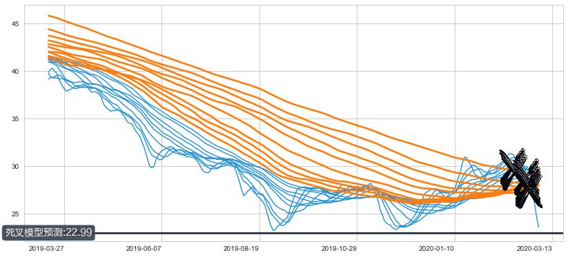 ➣ 34小时均线于(2020-02-24: 29.74)形成【死叉】基于【死叉历史模型】预测死叉后最低波谷价格: 27.12, 死叉后最低价格21.45,已经下跌超出预测最低波谷价格, 预期反弹